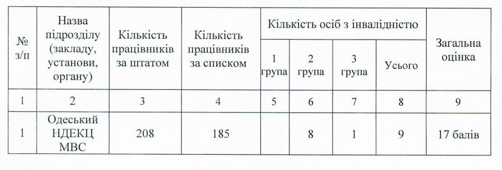 Висновок: за результатами оцінювання (17 балів) забезпечення реалізації прав осіб з інвалідністю в Одеському НДЕКЦ МВС вважається повним.